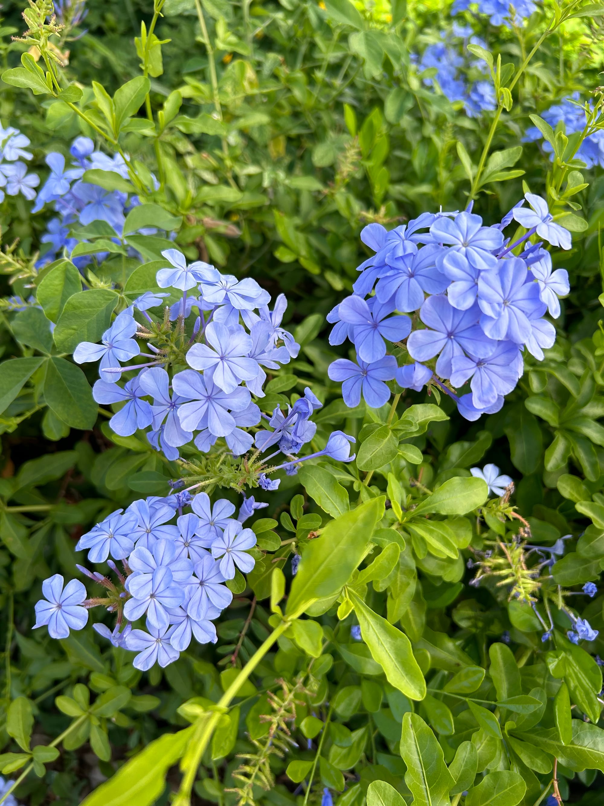 Plumbago auriculata (“Cape Leadwort”). Means “with ears,” referring to the leaves. Bisexual flowers. Sepals can be sticky enough to trap flies.